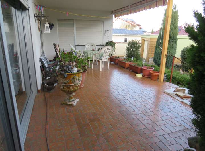 * große, überdachte Terrasse mit Markise und Blick ins Grüne