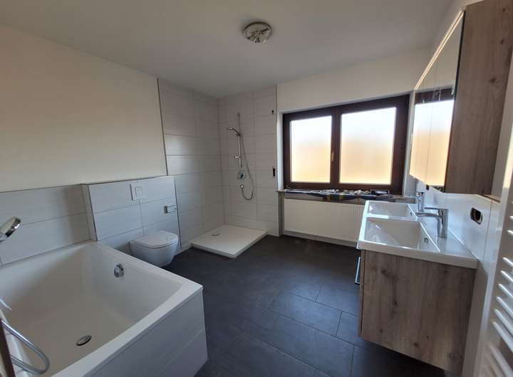 Vermietet wird eine großzügige, frisch renovierte Doppelhaushälfte mit einem schön angelgten Garten. Die Böden aller Zimmer sind gefliest. Das große Bad im ersten Stockwerk ist komplett erneuert.