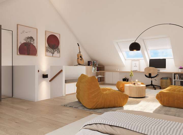 Das Dachgeschoss beindruckt mit einem geräumigen Studio, das vielseitig nutzbar ist - als Gästezimmer oder Homeoffice, als weiteres Schlafzimmer oder oder oder…