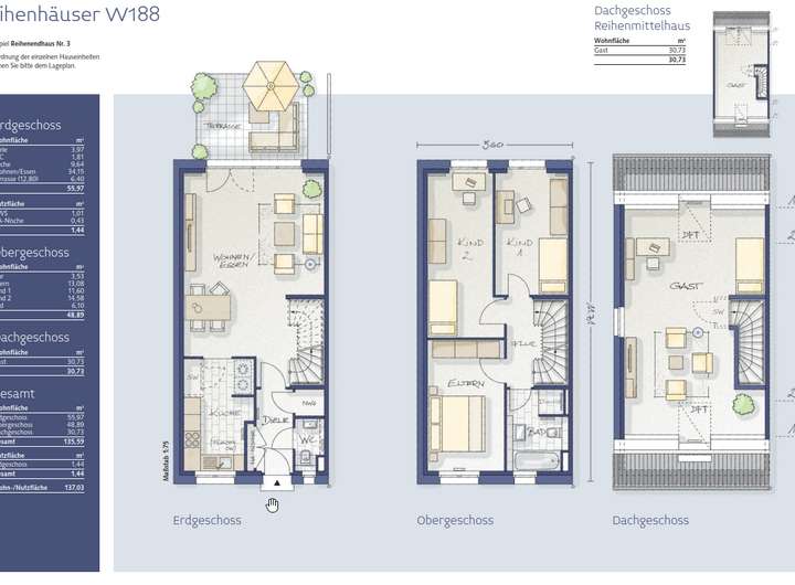 Das lichtdurchflutete Reihenmittelhaus punktet mit geschickt aufgeteilten Räumen. Das Erdgeschoss bildet mit dem Wohn-Essbereich und der offenen Küche das Herzstück des Hauses. Von hier gelangen Sie auf die Terrasse und in den Garten als Rückzugsort für entspannte Stunden.