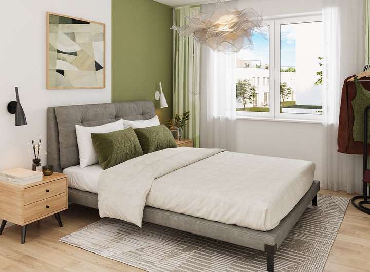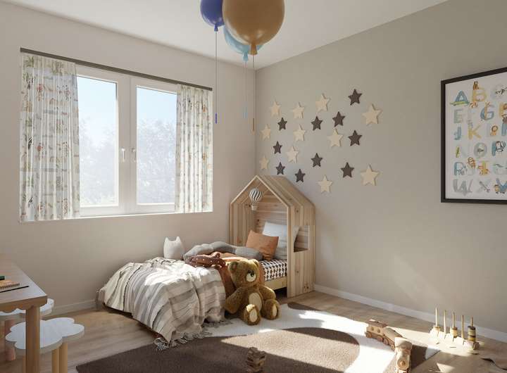 Im ersten Obergeschoss erwarten Sie drei nahezu gleichgroße Zimmern und ein modernes Tageslichtbad mit bodengleicher Dusche sowie Badewanne. Auch auf dieser Ebene sorgen große Fensterflächen in allen Räumen, teils mit bodentiefen Elementen, für ein lichtdurchflutetes Wohnerlebnis.