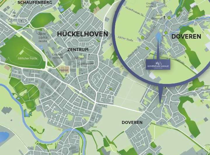 Die Häuser im neuen Wohnquartier „DOVERNER MÜHLE“ befinden sich an einer neu entstehenden Stichstraße abgehend vom Dammweg im Hückelhovener Ortsteil Doveren. Das kleine aber feine Neubau-Areal wird verkehrsberuhigt erschlossen und liegt im Grünen leicht abgesetzt von der Straße.