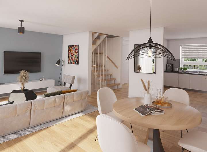 Wo Wohl und Fühlen unter einem Dach wohnen. In diesem Reihenhaus können Sie entspannt in die Zukunft blicken. Nachhaltiges Bauweise kombiniert mit zeitloser Gestaltung bietet Raum für individuelle Wohnbedürfnisse. Durchdachte Architektur und ein harmonisches Umfeld versprechen eine gute Atmosphäre in allen Lebensphasen: