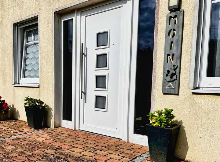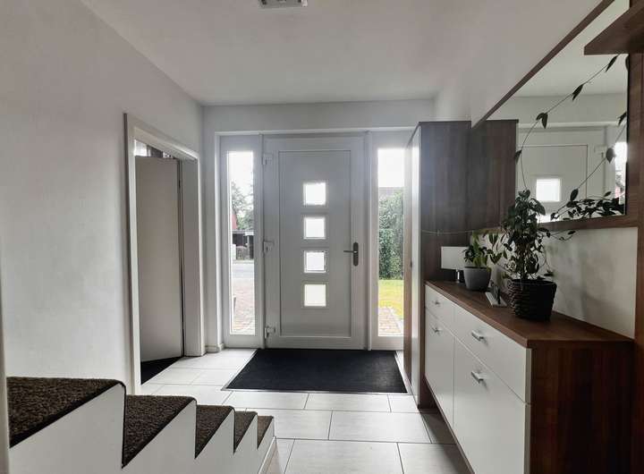 Der helle und freundliche Eingangsbereich sowie die großzügige Diele empfangen Sie beim Betreten des Hauses. Von hier aus sind alle Räume im Erdgeschoss bequem erreichbar. Ein praktischer Nebeneingang am Stellplatz führt über den Hauswirtschaftsraum ebenfalls ins Haus.