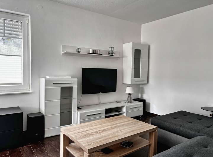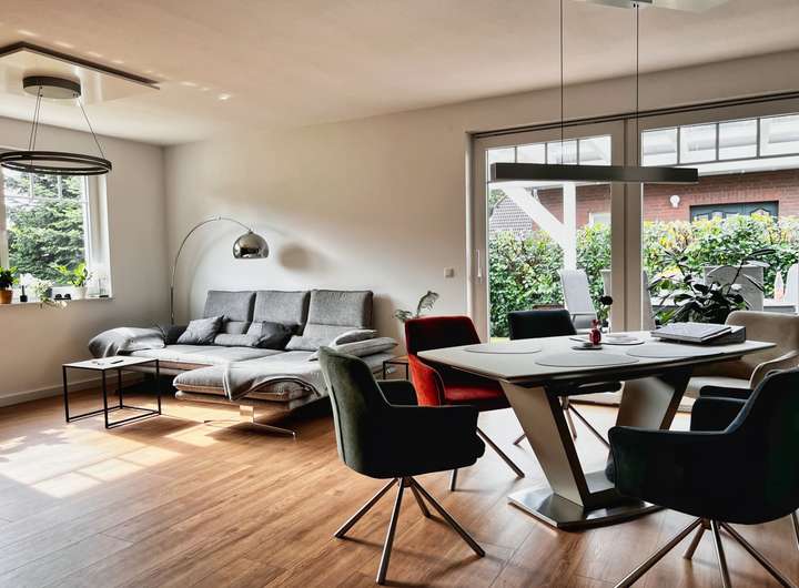 Das großzügige Wohnzimmer mit über 34 m² teilt sich in einen Essbereich und einen Couchbereich mit Medienwand. Hier können Sie gemütliche Abende mit Familie und Freunden verbringen.