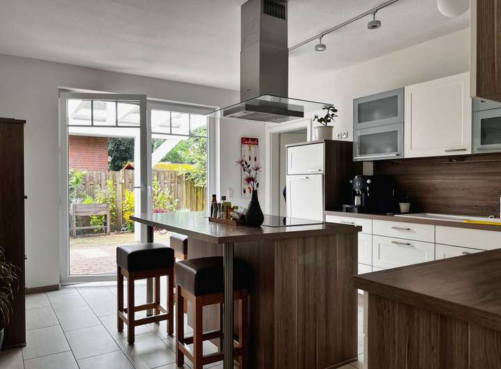 Die Küche ist ein wahres Highlight dieser Immobilie. Ausgestattet mit einer hochwertigen Einbauküche und einer zentralen Kochinsel, wird das Kochen hier zum puren Vergnügen. Von der Küche und dem Wohnzimmer aus gelangen Sie direkt auf die überdachte, große Terrasse mit elektrisch bedienbarer Verschattung – der perfekte Ort für gesellige Abende oder entspannte Stunden im Freien.