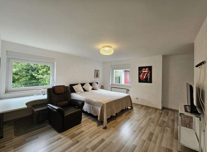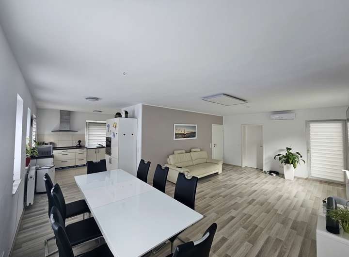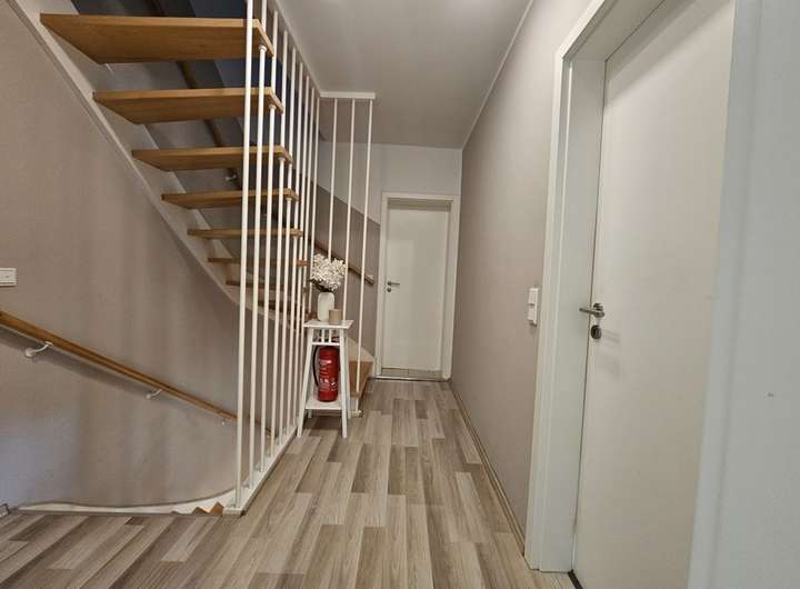 Es teilt sich in zwei separate Wohneinheiten auf, von denen die im Erdgeschoss liegende Einheit bei Bedarf auch wieder über einen separaten Außenzugang betreten werden kann. Mit insgesamt sieben Zimmern bietet das Haus viel Platz für eine große Familie oder für das Wohnen und Arbeiten unter einem Dach.