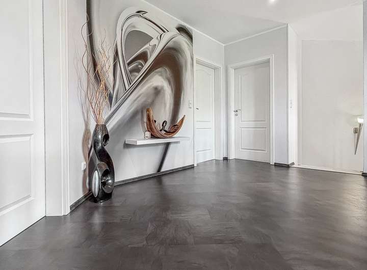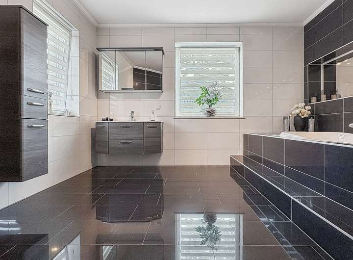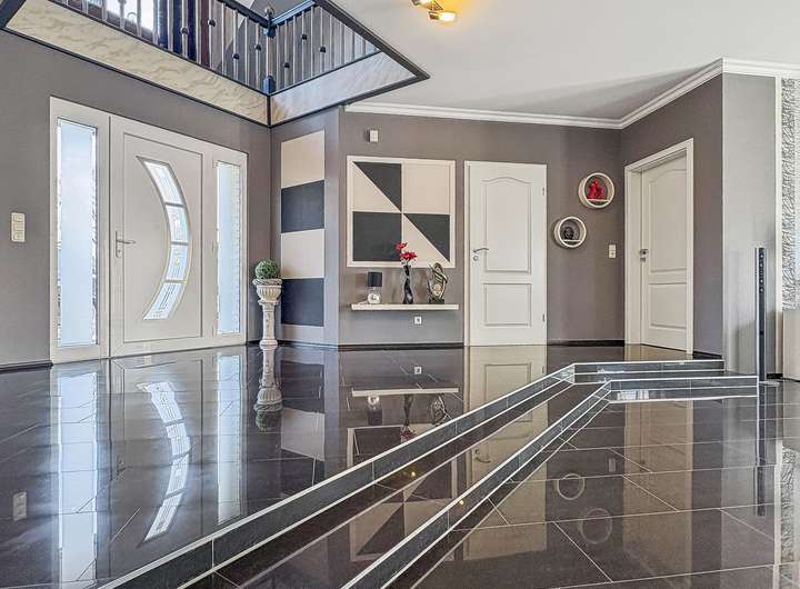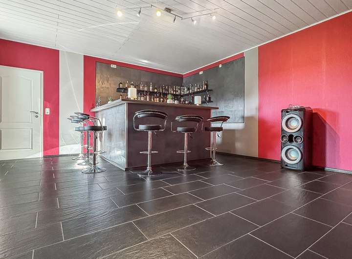 Im Erdgeschoss befindet sich ein großzügiges Wohnzimmer sowie ein modernes Schlafzimmer mit angrenzendem Badezimmer inklusive Badewanne. Zudem bietet das Erdgeschoss ein Gäste-WC. Die große, offene Küche geht nahtlos in den hellen Wohnbereich über, der direkten Zugang zum Wintergarten bietet. Außerdem erreicht von der Küche aus den großzügig angelegten Hauswirtschaftsraum. Ein angrenzender Partyraum mit Anschlüssen für eine Küche und eigenem Badezimmer mit Dusche sorgt für zusätzlichen Komfort. Besonders praktisch: Von hier aus gelangt man direkt zu dem Pferdestall mit vier Pferdeboxen.