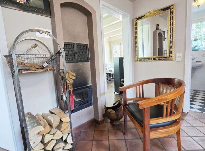 - Kachelofen im Wohnzimmer mit Warmwasser Aufbereitung (Einschür vom Gang aus)