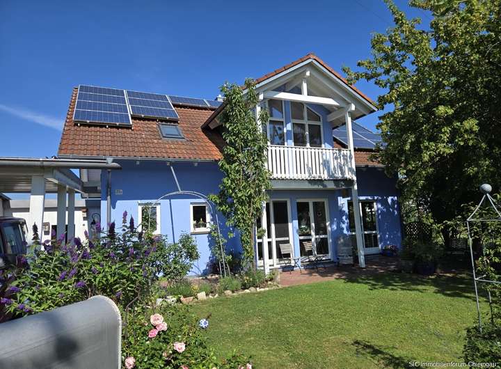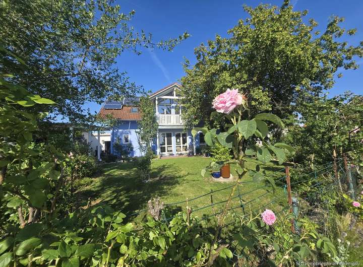 Einfamilienhaus (Holzständerbauweise), voll unterkellert, Bj. 1994 mit Holzschuppen und Carport. Der Garten ist liebevoll gepflegt und eingefriedet. Das Haus steht im Außenbereich.