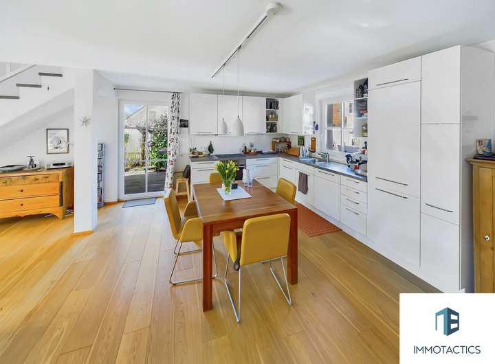 Beim Betreten des Hauses empfängt Sie der lichtdurchflutete Wohn- und Essbereich, der mit einer offenen Küche eine perfekte Verbindung aus Funktionalität und Gemütlichkeit schafft. Die große Fensterfront sorgt für eine helle Atmosphäre und ermöglicht den direkten Zugang zur überdachten Terrasse – ideal für entspannte Stunden im Freien. Hochwertige Fußbodenbeläge und eine angenehme Fußbodenheizung tragen zu einem behaglichen Wohngefühl bei.