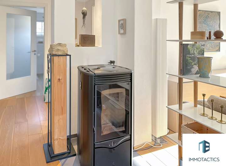 Im Erdgeschoss befinden sich zudem ein flexibles Büro oder Gästezimmer sowie ein modernes Badezimmer. Ergänzt wird die Etage durch einen Heizungsraum mit moderner Pelletheizung.