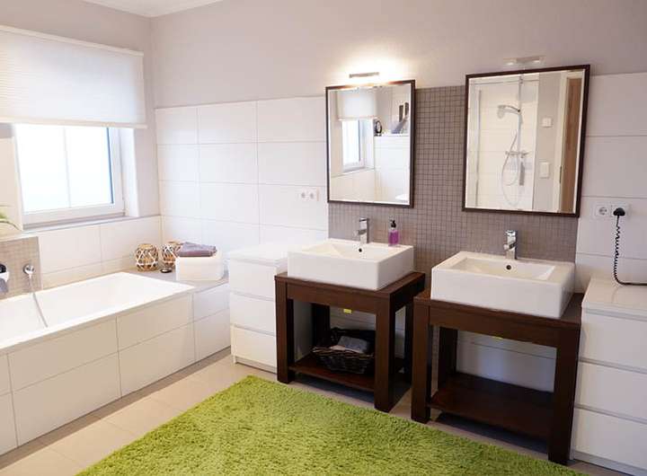 - Bad mit gefliestem Duschboden und Duschabtrennung in Glas, Badewanne, 2 Waschtische und wandhängendem WC