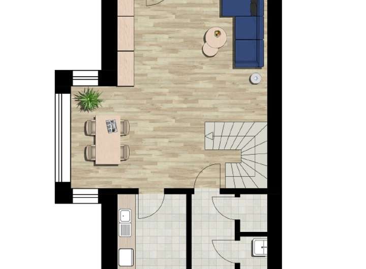 Im Erdgeschoss erwartet Sie ein besonders großzügiges Wohn- und Esszimmer, das durch seine helle Atmosphäre sofort ins Auge fällt. Die separate Küche – ausgestattet mit einer modernen Einbauküche – bietet ausreichend Platz für kulinarische Entfaltung. Ein einladender Flur, ein praktisches Gäste-WC sowie ein Abstellraum runden diese Ebene ideal ab.