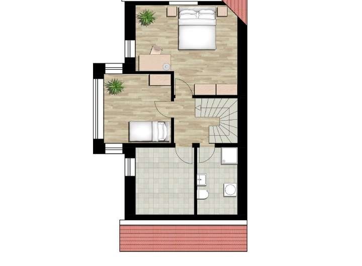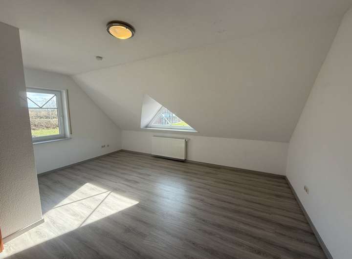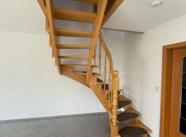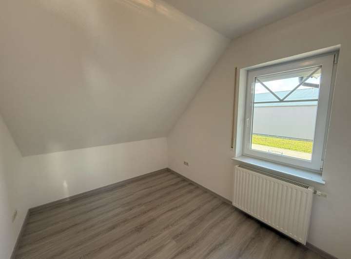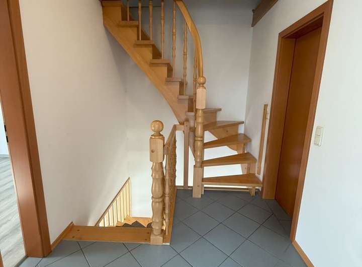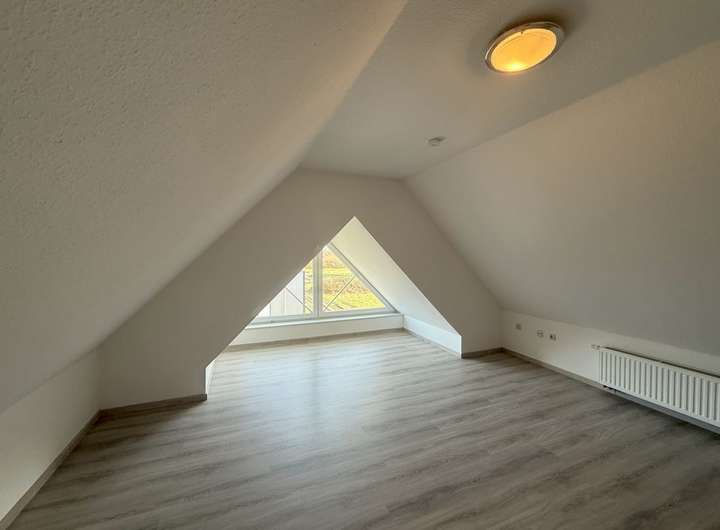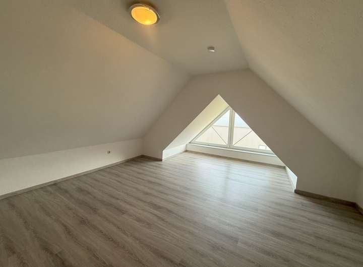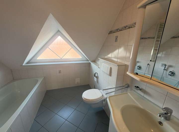 Im Wohn- und Essbereich führt eine offen gestaltete Treppe ins Obergeschoss. Dort befinden sich drei gut proportionierte Schlafzimmer, die vielfältige Einrichtungsmöglichkeiten bieten, sowie ein komfortables Badezimmer mit Dusche und Badewanne. Von hier aus gelangen Sie über eine massive Treppe in das vollständig ausgebaute Dachgeschoss, das sich hervorragend als zusätzliches Schlafzimmer, Arbeitsbereich oder Hobbyraum eignet.