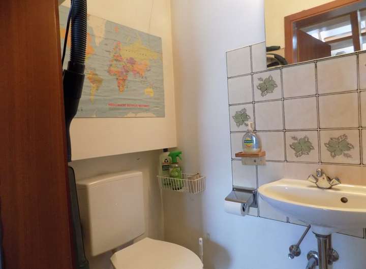 Die Küche und das Esszimmer sind durch Einbauschränke unterteilt, die man nach Herausnahme zu einem großen Koch- und Essbereich machen könnte. Vom Esszimmer gelangt man auf die Terrasse und ins Wohnzimmer. Im Erdgeschoss befindet sich zudem ein Gäste-WC. Das Haus verfügt durch die Fenstergestaltung über viel Licht. Zusätzliche Glasbausteine sorgen für Tageslicht im Treppenhaus. Bad mit Wanne, Dusche, WC und zwei Waschbecken befindet sich im Obergeschoss. Im Dachstudio wurde nachträglich ein WC und ein Waschbecken eingebaut, sodass für Gäste die Privatsphäre erhalten bleibt.