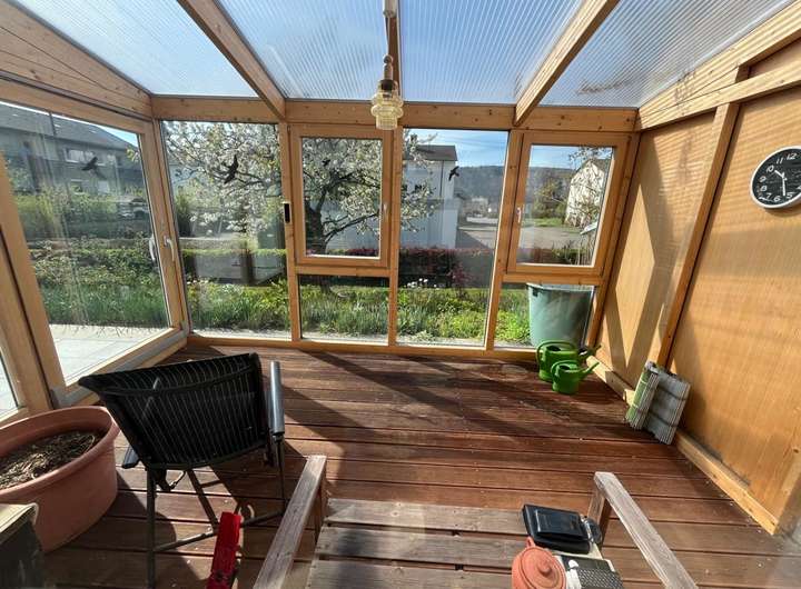 Das Haus befindet sich in gepflegtem Zustand, viele Einbauschränke sorgen für Ordnung. Die Böden sind mit Teppich belegt, die Ölheizung wurde vor einigen Jahren durch einen neuen Kessel modernisiert. Ein Highlight ist der extra angelegte Naturkeller. Er sorgt ganzjährig für gleichbleibende Temperaturen, sodass Vorräte gut gelagert werden können. Die Terrasse wurde im vergangenen Jahr neu angelegt. Der Wintergarten wurde 2020 erstellt und bietet einen zusätzlichen Raum zum Verweilen. Terrasse und Wintergarten können mit vorhandenen Jalousien beschattet werden.