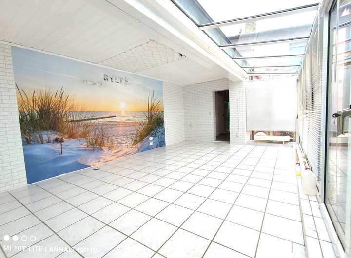 Das Highlight hier ist die abgehangene Decke mit dem indirekten Licht, dass eine warme und einladende Stimmung im Raum erzeugt. Weiterhin sind eine Küche und ein Gäste-WC sowie ein großzügiger Wintergarten, mit Zugang zur überdachten Terrasse in dieser Etage vorhanden.