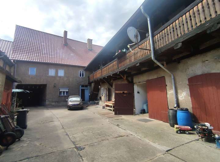 Das Haupthaus besteht aus zwei Vollgeschossen, einer Teilunterkellerung und bietet großzügige Räumlichkeiten mit jeweils ca. 200 m² Grundfläche zzgl. Dachgeschoss. Das langgestreckte Nebengebäude, mit beeindruckenden Laubengang aus Eichenholz, ist über eine Holztreppe zu erreichen. Es besteht aus 2 Etagen und bietet zusätzlich Ausbaufläche. Des Weiteren befinden sich 3 Garagen und einige Schuppen im Hof. Der Garten mit altem Baubestand läd dazu ein, die Ruhe und Stille der Natur zu genießen.