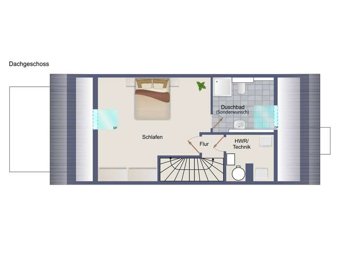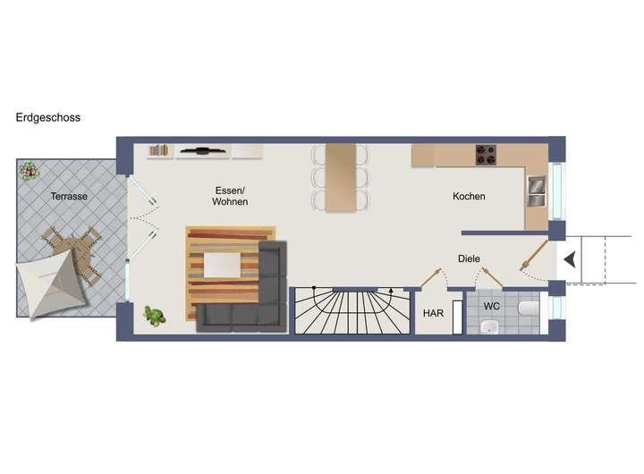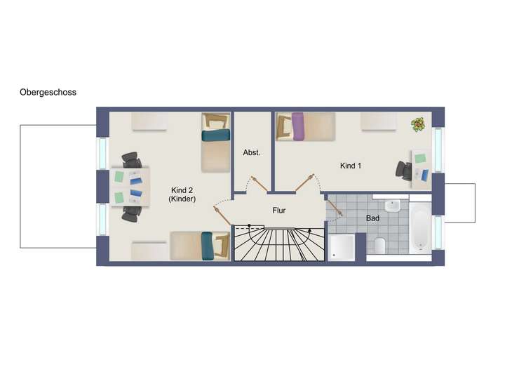 Das hier vorgestellte Reihenmittelhaus verfügt über ca. 126m² Wohnfläche, verteilt auf Erd-, Ober- und Dachgeschoss. Herzstück des Hauses ist der offene Wohn- und Essbereich mit Zugang zur eigenen Terrasse. Im EG befindet sich zudem ein praktischer Abstellraum sowie ein WC. Das Obergeschoss ist mit zwei Schlafzimmern, Bad und Abstellraum das Reich der Kinder. Ihr Dachgeschoss beherbergt ein drittes Schlafzimmer und ein optionales Duschbad. Hier ist auch der Hauswirtschaftsraum untergebracht.
