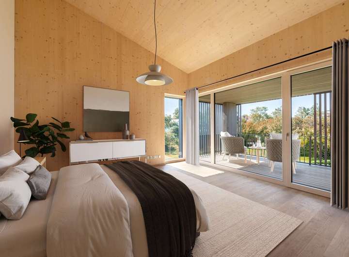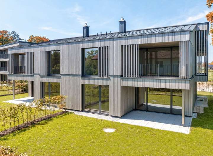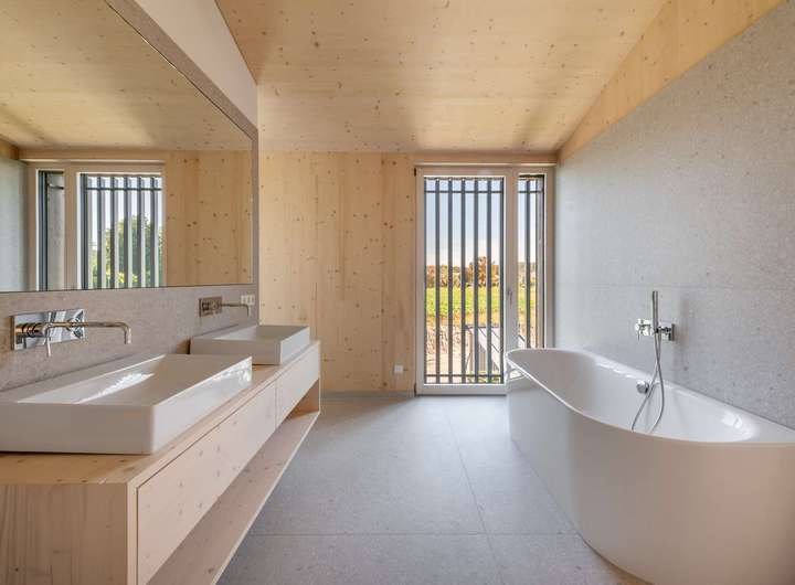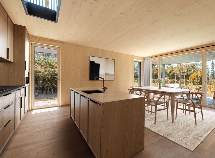 Weiß lasiertes Fichtenholz und hellgraue Terrazzo-Fliesen, atemberaubende Glasfronten und imposante Deckenhöhen bis ca. 4,40 Meter verbinden sich zu einem hochklassigen Domizil mit stylischem Twist. Minimalismus und Wohlfühlambiente ergänzen sich auf perfekte Weise. Das Raumangebot zeigt sich ebenso intelligent wie familiengerecht. Dieser Massivholz-Neubau begeistert durch seine hohe Qualität, das durchdachte Nachhaltigkeits-Konzept und eine bestechende Ästhetik.
