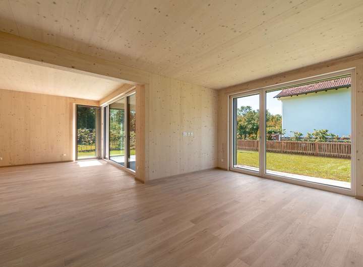 - Nachhaltige Massiv-Holzbauweise: Die Haushälfte wurde in hochwertiger Holz-Massivbauweise aus 5-Schicht-Platten des österreichischen Qualitätsunternehmens Theurl erstellt. Das Fichtenholz wurde leicht angeschliffen und zweimal weiß lasiert, sodass die helle Farbe und die einmalige Oberflächenstruktur dauerhaft erhalten bleiben.