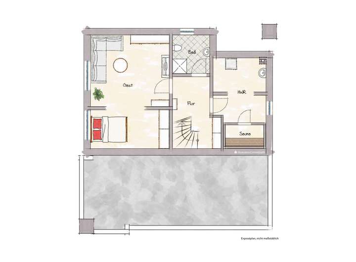Das Kellergeschoss beherbergt zudem ein großes Gästezimmer und ein modernes Duschbadezimmer. Außerdem einen Hauswirtschaftsraum für Waschmaschine, Trockner und Heizungsanlage sowie als besonderes Highlight eine Sauna.