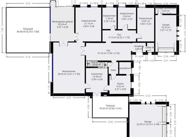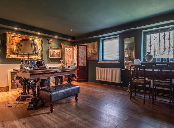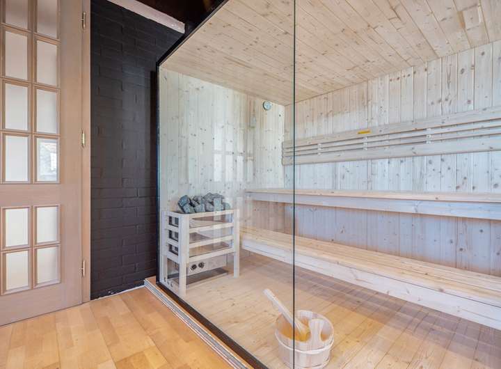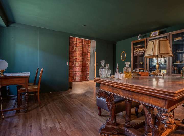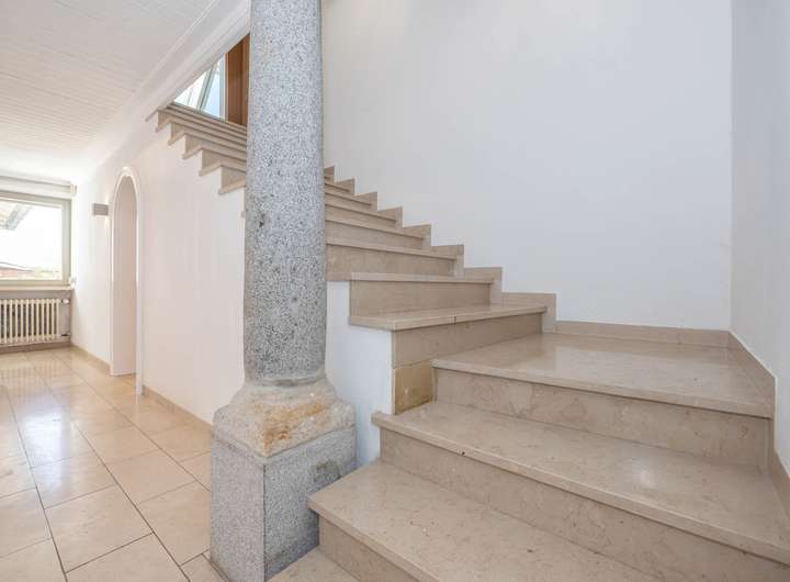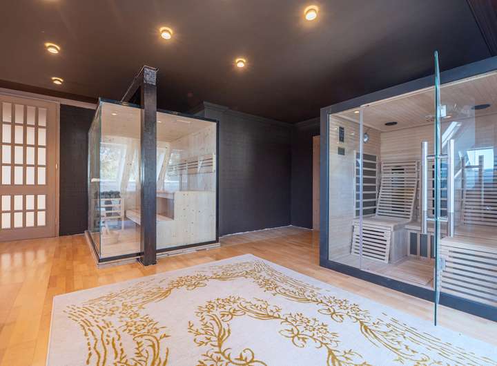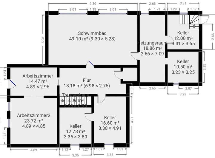 Im Untergeschoss befinden sich zwei Arbeitszimmer mit Tageslicht, ein Schwimmbad, ein kleines Badezimmer sowie weitere Kellerräume.