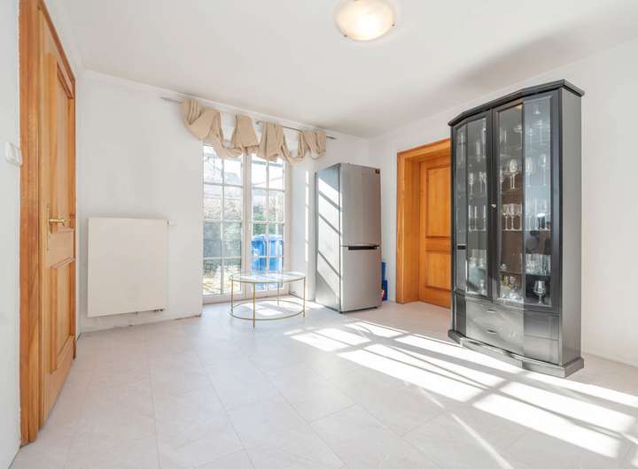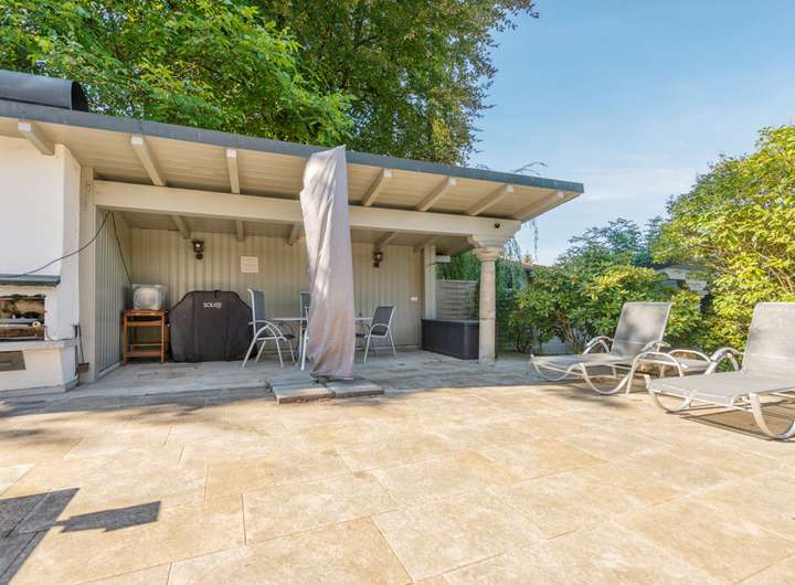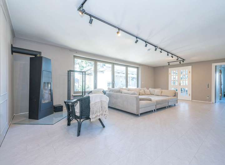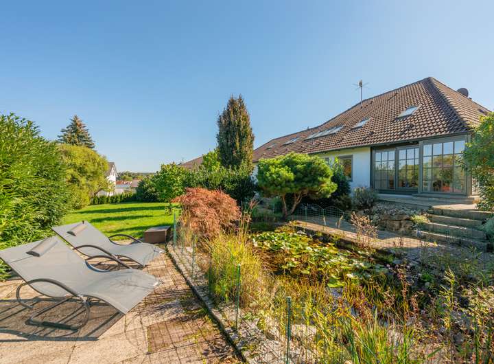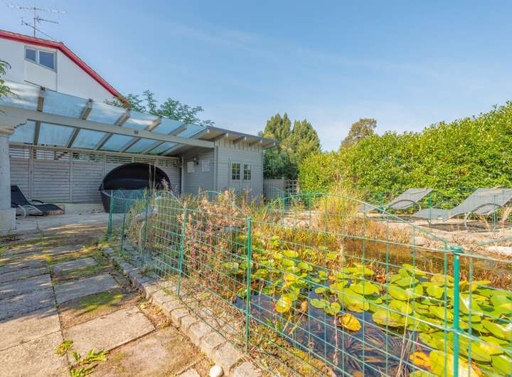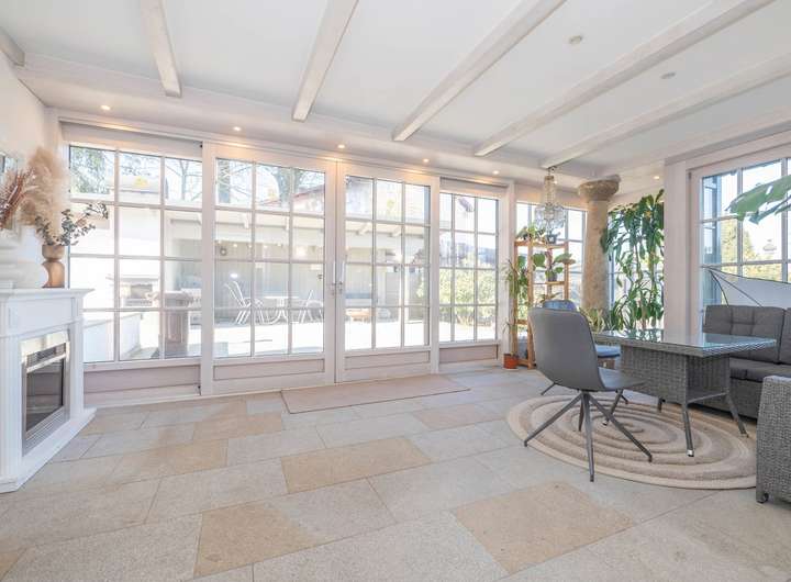 Ein besonderes Highlight des Hauses ist der beheizbare Wintergarten, der ganzjährig genutzt werden kann. Von hier aus gelangt man direkt auf die große Terrasse, die sich ideal für gesellige Abende oder entspannte Stunden im Freien eignet. Der angrenzende Teich und das weitläufige Grundstück bieten zusätzlichen Raum für Gartengestaltung und Erholung.