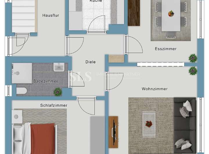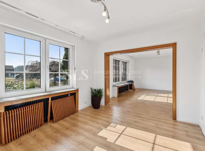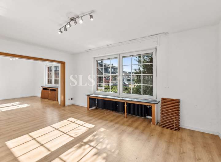 Im Erdgeschoss sorgen klassische Sprossenfenster für eine einladende, gemütliche Atmosphäre. Das großzügige Doppelwohnzimmer bietet reichlich Platz für gemeinsame Stunden und lässt sich bei Bedarf auch in zwei separate Räume unterteilen. Durch die durchdachte Raumaufteilung wirkt die gesamte Etage offen und wohnlich, perfekt für das Familienleben.