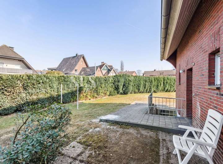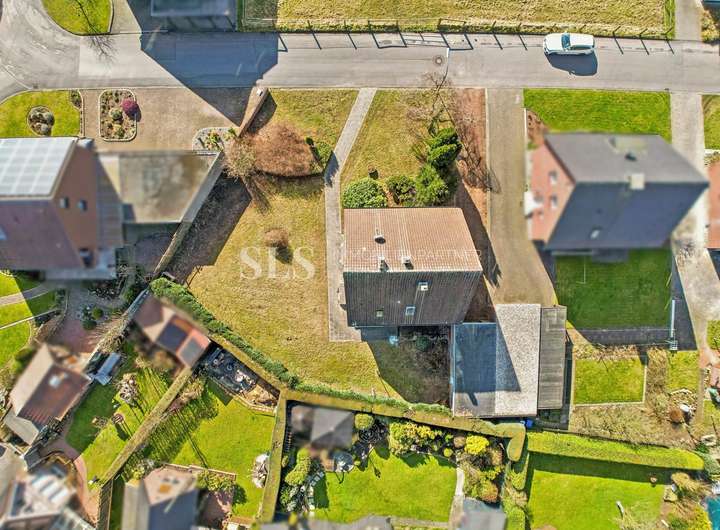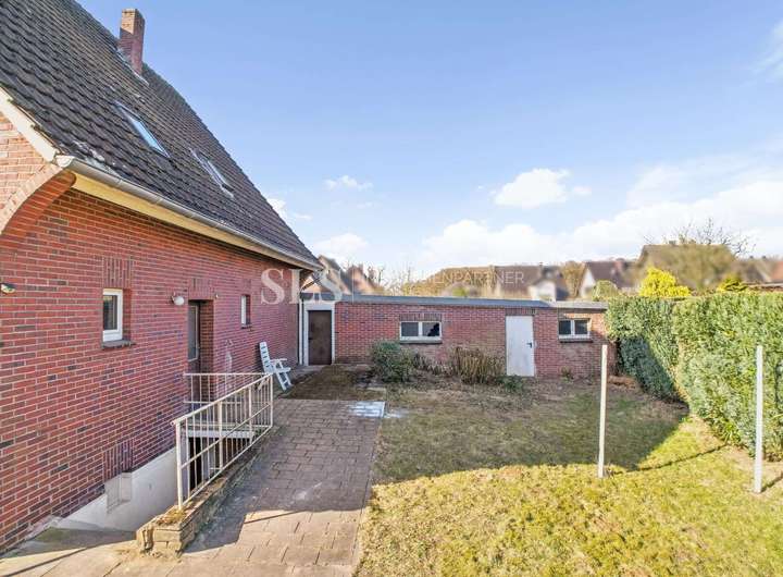 Das Grundstück ist großzügig geschnitten und rund um das Haus mit viel Grün gestaltet. Ein gepflegter Garten lädt zum Spielen, Gärtnern oder Entspannen ein. Links neben dem Haus führt eine lange Einfahrt zur Garage, sodass mehrere Fahrzeuge bequem auf dem eigenen Grundstück geparkt werden können. Neben der Garage befindet sich ein massiv gebauter Abstellraum, der sich ideal zur Lagerung von Gartenmöbeln und Geräten eignet. Eine gepflasterte Terrasse bietet zusätzlichen Platz für gesellige Stunden im Freien.