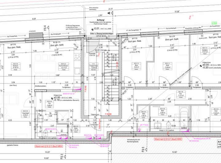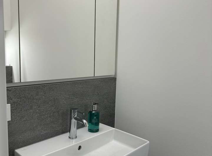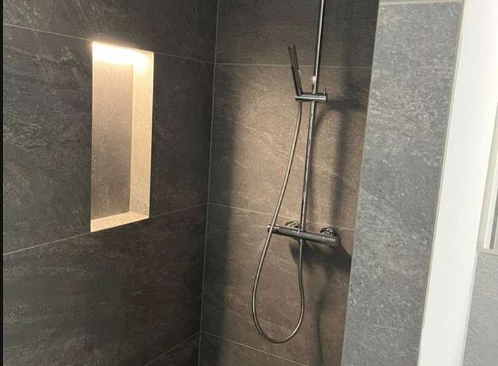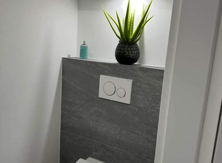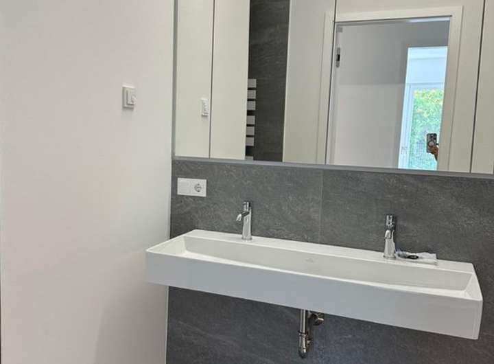 - Duschbad ausgestattet mit Walk-in-Dusche mit Wandelement als Duschabtrennung inkl. Rainshower und Brause, Desweiteren gibt es eine Badewanne mit LED-Beleuchtung, großes Waschbecken, Armatur von hansgrohe, Handtuchwärmer und Deckenspots, Spiegeleinbauschrank, separat gibt es ein WC sowie ein weiteres Gäste-WC.