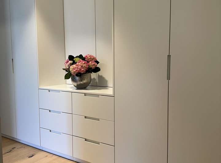 - Weiße flächenbündige Innentüren mit modernen Edelstahlbeschlägen.
