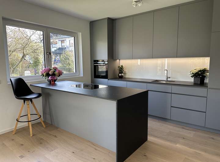 - Schreinerküche mit Kochinsel, graue Fronten und Naturstein Arbeitsplatten (Nero Assoluto), Bora Induktionskochfeld mit integrierter Dunstabzugshaube, Siemens Backofen, Kühl-Gefrier-Kombination, Geschirrspüler, eingelassene Edelstahl-Spüle mit Armatur (Grohe)