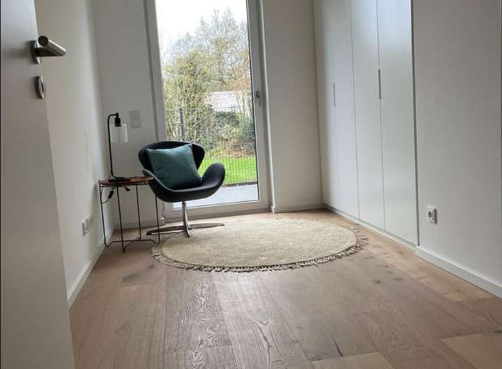 Diese sehr attraktive 5,5 Zimmer-Immobilie im Bauhaus-Stil befindet sich - wie ein Bungalow - auf einer Ebene in einem neuwertigen luxuriösen Komplex in ruhiger Innenhoflage. Der 2024 fertiggestellte Neubau (Effizienzklasse EE 55) mit ansprechender, moderner Architektur umfasst lediglich drei Wohneinheiten mit schönem Garten und liegt in einer verkehrsberuhigten Seitenstraße, eingebettet in eine grüne Umgebung mit intakter, gewachsener Nachbarschaft.