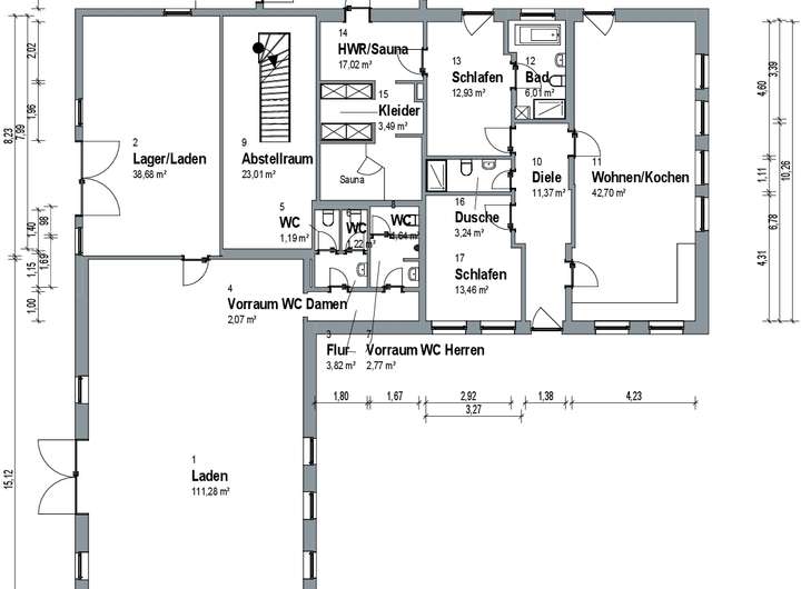 großzügige Ladenfläche, Lager, Vorraum sowie zwei Damen und ein Herren WC.