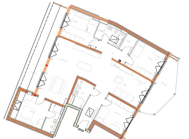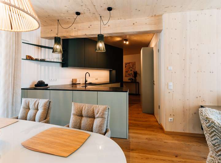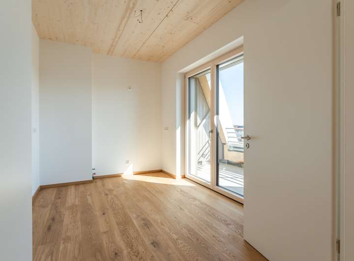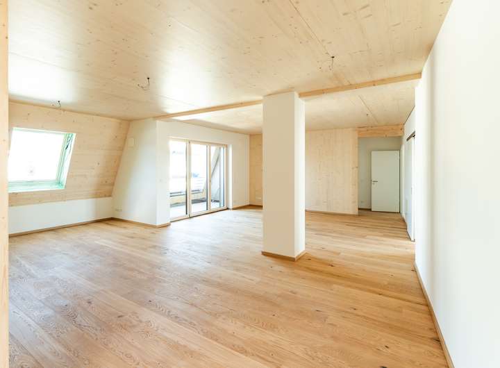 Um sich ins Stadtbild einzufügen, sind die Fassaden klassisch verputzt. Auch innen sind helle Wände vorgesehen – zusammen mit charaktervollen Akzenten: In den allermeisten Wohnungen gibt es mindestens eine Wand aus schönem Sichtholz. Dabei haben Sie viele Optionen, zum Beispiel Zirbenholz: markante Maserung, gesundheitsfördernde Wirkung – wie geschaffen für DAS STAMMHAUS. (Die Innenansicht ist unverbindlich, sie soll lediglich das Wohnklima darstellen.)