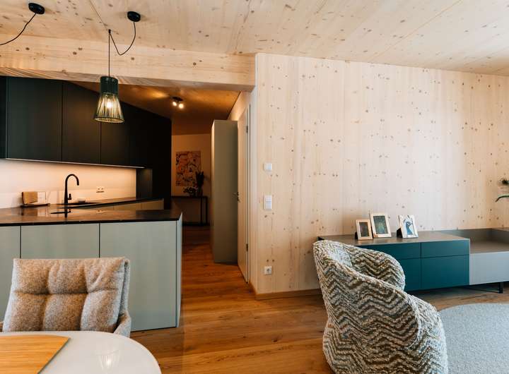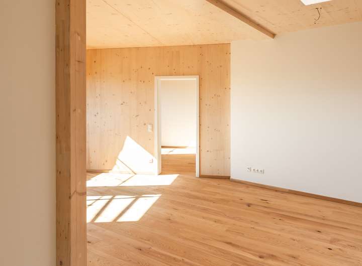 Um sich ins Stadtbild einzufügen, sind die Fassaden klassisch verputzt. Auch innen sind helle Wände vorgesehen – zusammen mit charaktervollen Akzenten: In den allermeisten Wohnungen gibt es mindestens eine Wand aus schönem Sichtholz. Dabei haben Sie viele Optionen, zum Beispiel Zirbenholz: markante Maserung, gesundheitsfördernde Wirkung – wie geschaffen für DAS STAMMHAUS. (Die Innenansicht ist unverbindlich, sie soll lediglich das Wohnklima darstellen.)