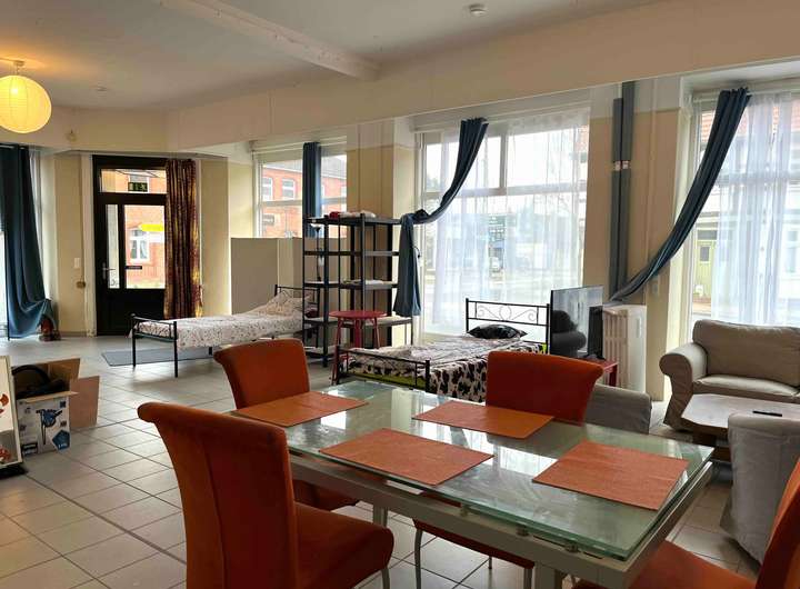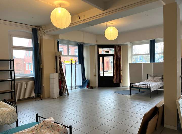 Die großen Schaufenster des ehemaligen Ladens sind noch vorhanden. Die Fläche wurde in einen großen Wohn-/Essbereich und Schlafbereich - wie ein Loft umgebaut.