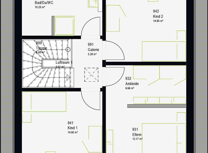 Im Dachgeschoss unter dem klassischen Satteldach finden Sie Ihr privates Reich. Der große Flur verbindet zwei Kinderzimmer und ein Elternschlafzimmer mit dem geräumigen Bad. Hier können Sie sich zurückziehen und entspannen.