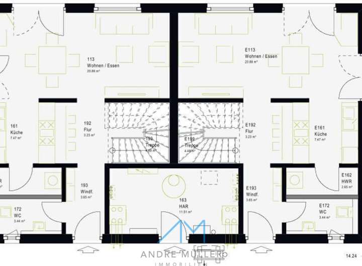 Die beiden Wohneinheiten sind spiegelbildlich angeordnet und können an die individuellen Wünsche der Baufamilien angepasst werden. Im Erdgeschoss befinden sich je ein offener Koch-, Ess- und Wohnbereich, ein Gäste-WC und ein Hauswirtschaftsraum, der von beiden Parteien genutzt werden kann. Die u-förmige Treppe führt in das obere Stockwerk, wo Platz für ein geräumiges Bad, mehrere Schlafräume oder Hobby- und Arbeitszimmer ist.