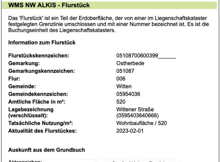 Das Baugrundstück liegt in einer zentralen und naturnahen Wohngegend von Witten Herbede. Die Umgebung zeichnet sich durch eine harmonische Nachbarschaft und ein familienfreundliches Umfeld aus. Einkaufsmöglichkeiten, Schulen, Kindergärten und Ärzte sind in wenigen Minuten erreichbar. Der nächstgelegene Autobahnanschluss bietet eine gute Anbindung an das Ruhrgebiet.