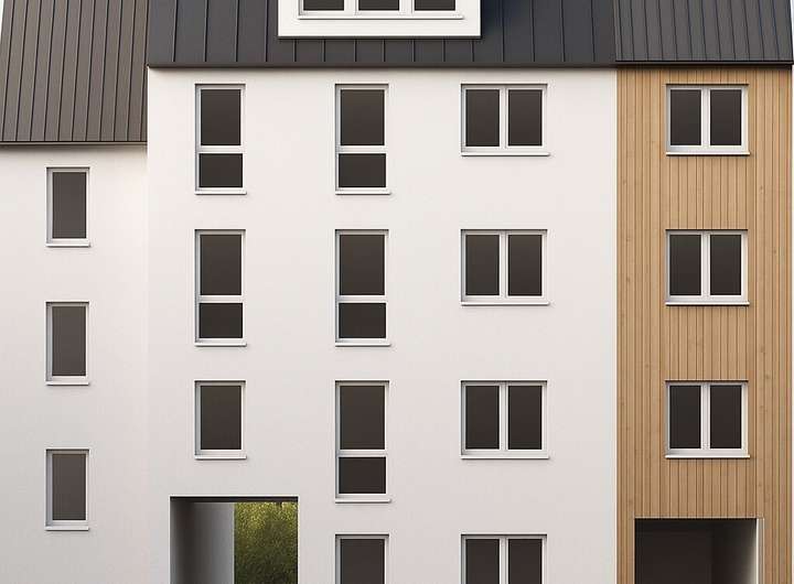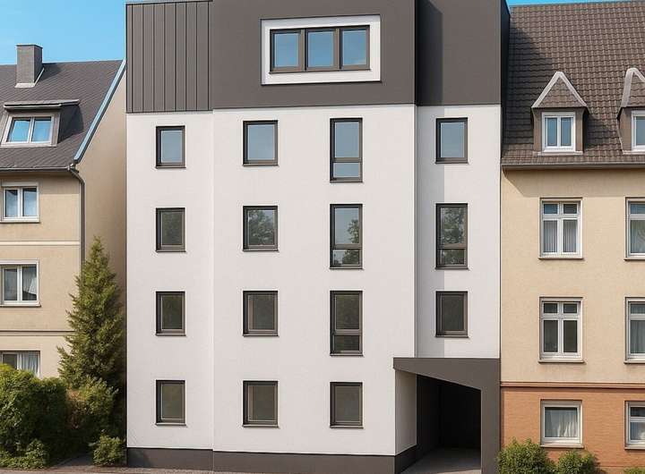 Der geplante Neubau gehört zur Gebäudeklasse 4 und umfasst vier Geschosse plus ausgebautes Dachgeschoss. Geplant sind 11 PKW-Stellplätze (davon 4 Garagen) sowie 24 Fahrradstellplätze. Die Architektur überzeugt durch eine helle Putzfassade, Isolierverglasung, ein Satteldach mit harter Bedachung und begrünte Hof- und Spielflächen – ideal für ein modernes, urbanes Wohnkonzept mit hoher Vermietbarkeit.