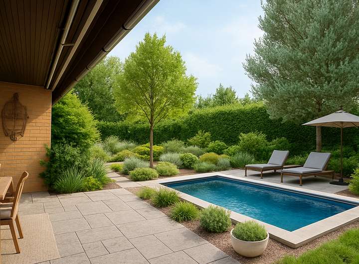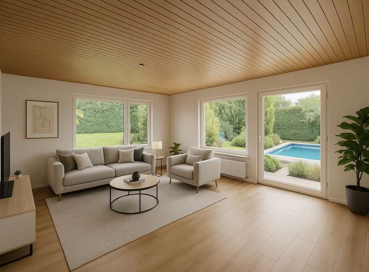 Winkelbungalow der Firma Streif, Baujahr 1972, mit großer sonniger Süd-West-Terrasse und Pool im Musikerviertel von Taunusstein-Wehen.