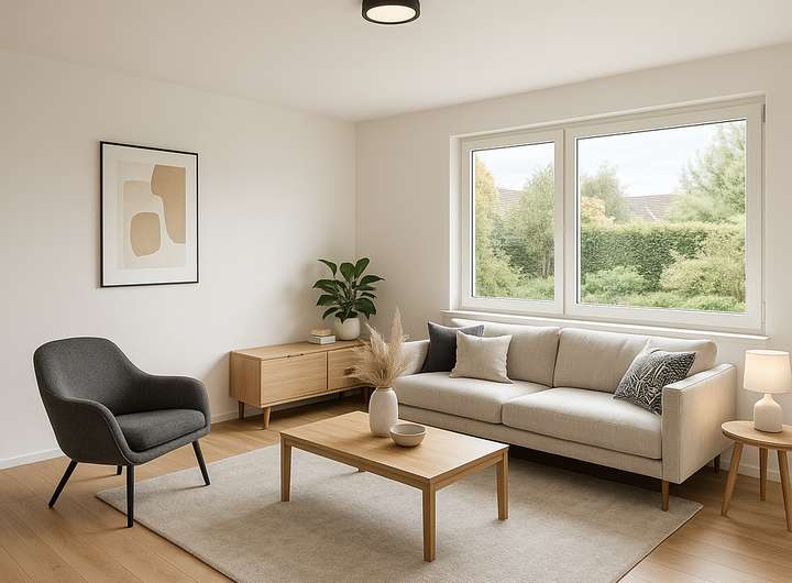Im Erdgeschoss befinden sich neben Gäste-WC, Diele und Küche ein großes Ess- und Wohnzimmer, die durch eine große Schiebetür verbunden sind. Im angrenzenden Teil sind über einen Flur zwei kleine Kinderzimmer, ein helles Bad und das große Schlafzimmer zu erreichen. Außerdem ist hinter einer Tür der Aufgang zum Dachboden verborgen.