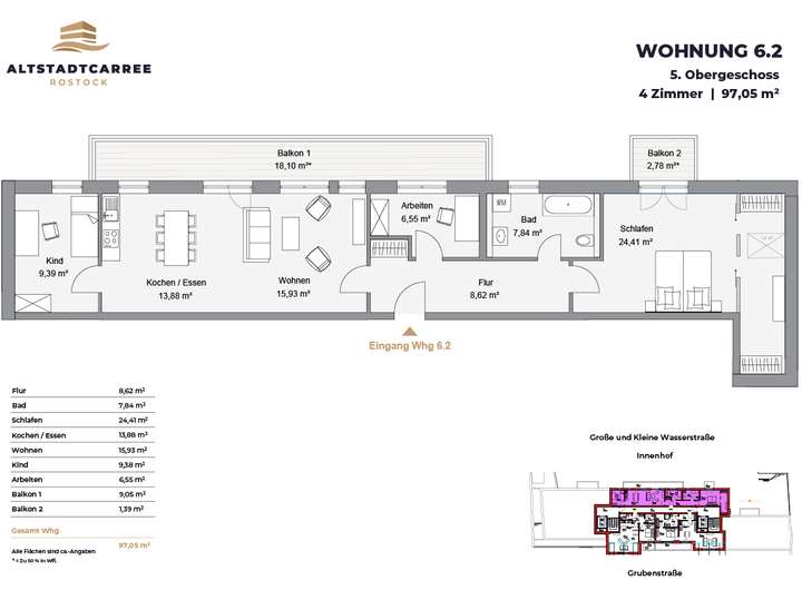 Das Altstadtcarree mit seinen 58 Wohnungen liegt in der Östlichen Altstadt von Rostock, einem alten und sehr lebenswerten Ortsteil. Die Östliche Altstadt hat sich seine ruhige, kleinstädtische Atmosphäre bewahrt. Direkt im Zentrum, entlang der Großen Wasserstraße sowie der Kröpeliner Straße, befinden sich viele seit Jahren etablierte Einzelhandelsgeschäfte. Auch die wichtigsten Sozial- und Verwaltungseinrichtungen sind hier zu finden.