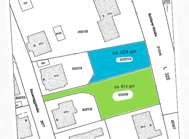 1338 qm Gesamtgrundstück, geteilt in 524 qm und 814 qm Grundstück. Bebaubar mit je 2 Wohneinheiten pro Grundstück, gesamt max. 4 Wohneinheiten. Sie können natürlich auch ein großes Einfamilienhaus erstellen. Für ein Projekt mit ca. 480 qm Wohnfläche gab es bereits eine Baugenehmigung. Für die Zufahrt zum Grundstück gibt es bereits eine Planung mit Baugenehmigung, diese im Kaufpreis enthalten ist.