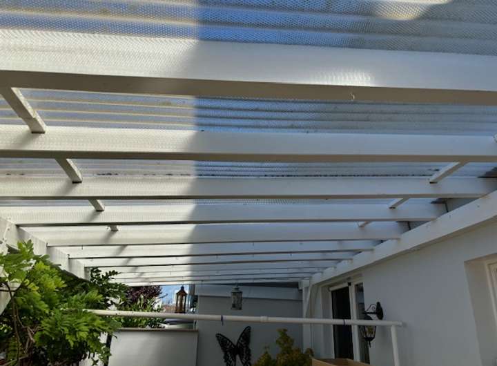 um Kunstoff bzw. wenige Alufenster mit Jalousien.