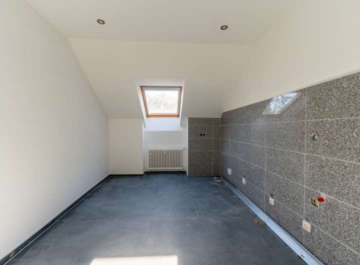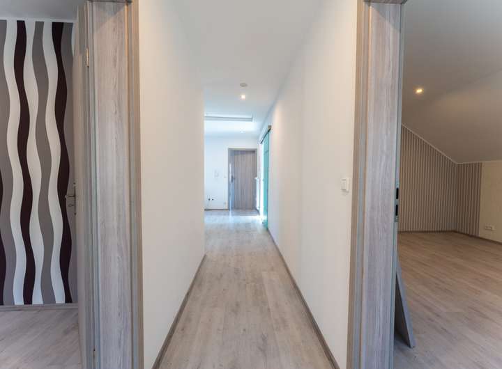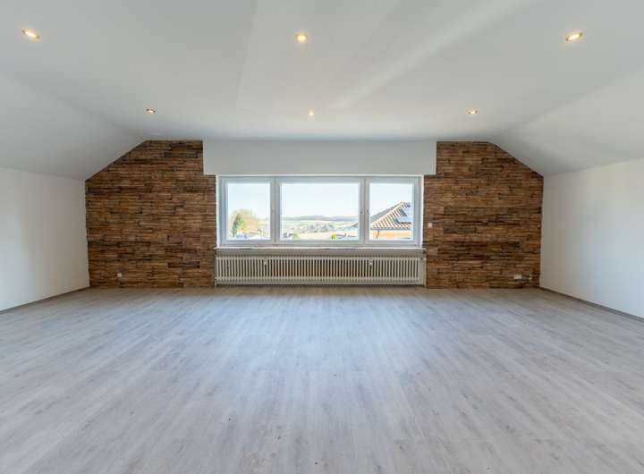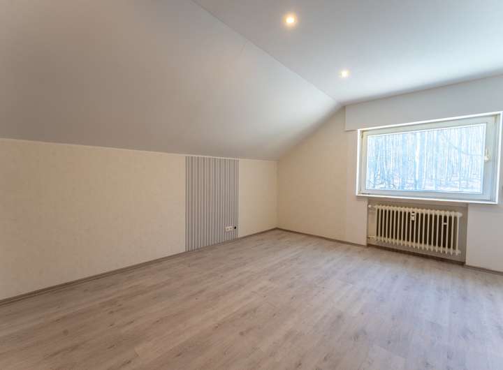 Die Dachgeschosswohnung ist aufgeteilt in einen Flur, ein großzügiges Wohnzimmer, eine Küche, zwei Schlafzimmer und einen Abstellraum. Auch diese Wohnung wurde bereits modernisiert.