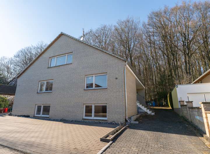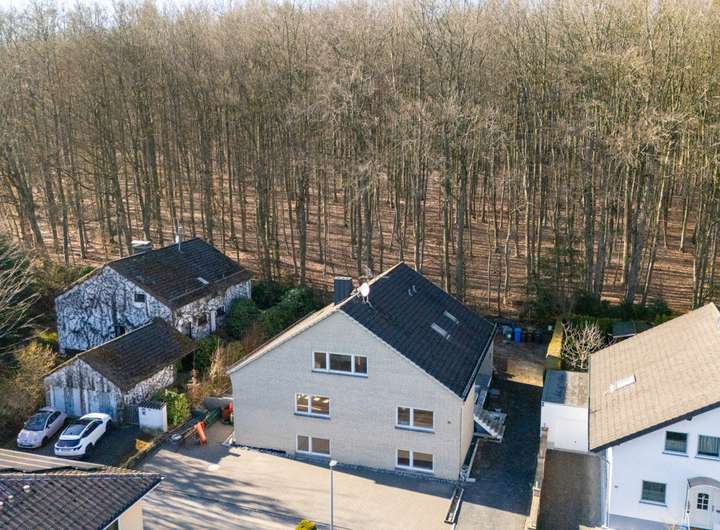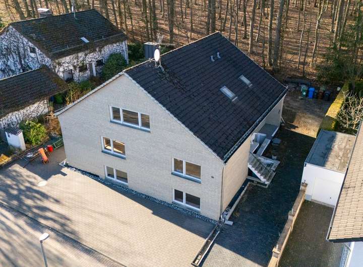 Der Außenbereich überzeugt mit einem Hinterhof, der direkt an den Wald angrenzt – ideal für Naturliebhaber. Hier befindet sich auch die Garage. Vor dem Haus stehen mindestens vier weitere Außenstellplätze zur Verfügung.